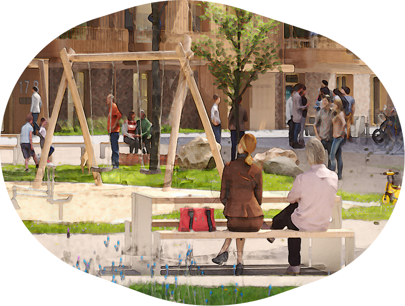 Das Quartier bietet naturnahe Spielräume für Kinder und eine inspirierende Umgebung für alle Generationen. Erwachsene finden Orte für Begegnung und Engagement ebenso wie ruhige Rückzugsbereiche. Die barrierearme, inklusive Gestaltung sowie unterstützende Angebote ermöglichen ein selbstbestimmtes Leben in jedem Alter.